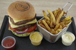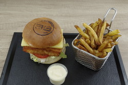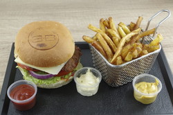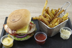 Filet de poulet, tranches de lard fumé, cheddar affiné, salade, tomates, oignons rouges, pickles, sauce au choix